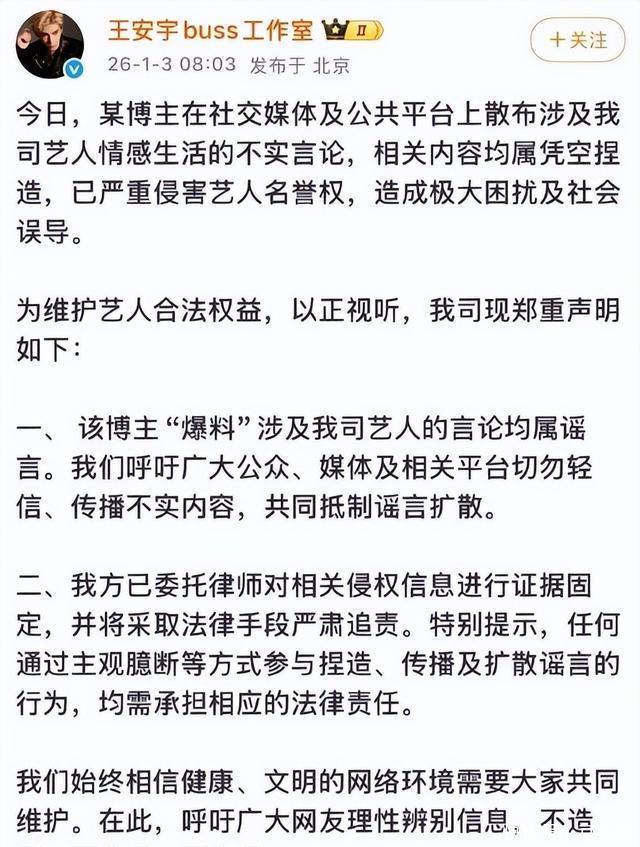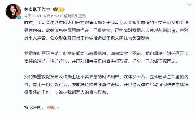 而关晓彤和鹿晗也迅速采取了行动,对网友进行警告,不要传播谣言,她也同样会用司法手段维护自己的名誉。 这谣言的另一位主人公王安宇也是很快就发出来了回应公告,内容就和他们都差不多了。